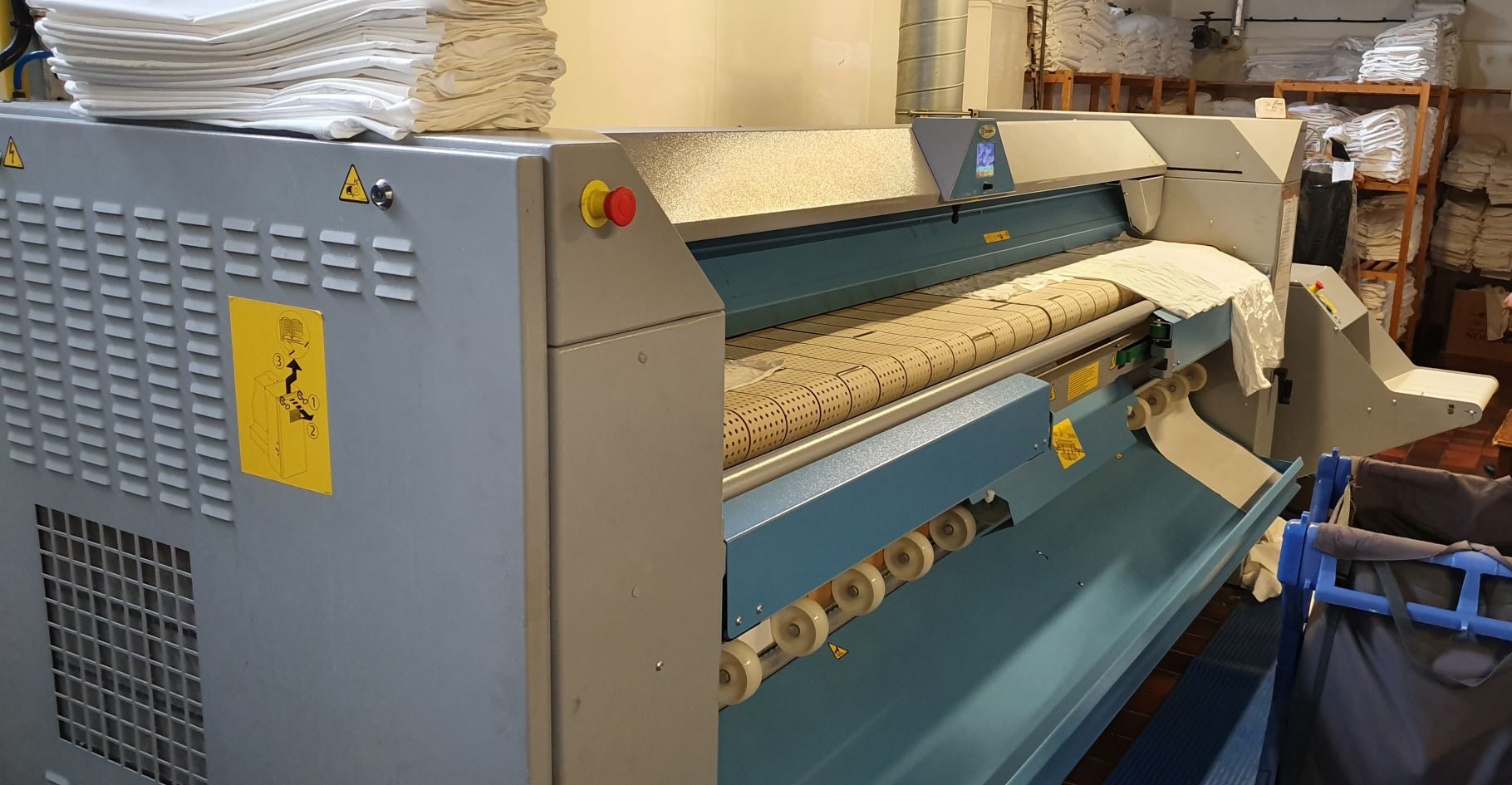 1 x ELECTROLUX Model IC44832 FFS, gas-heated, complete ironing unit consisting of clip-feeding machine, 3200mm working width, gas-heated ironer with in-built folder, cross-folder and stacker. All from 2018. Ideal for small laundry with limited floor-space.