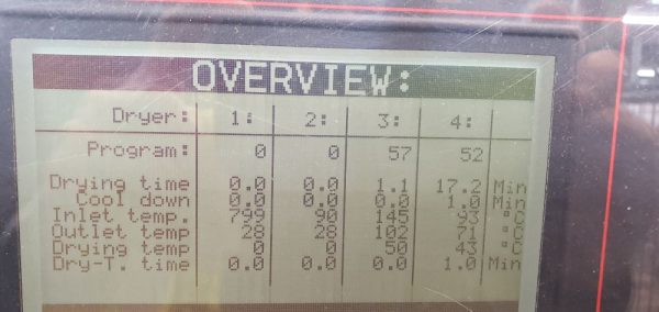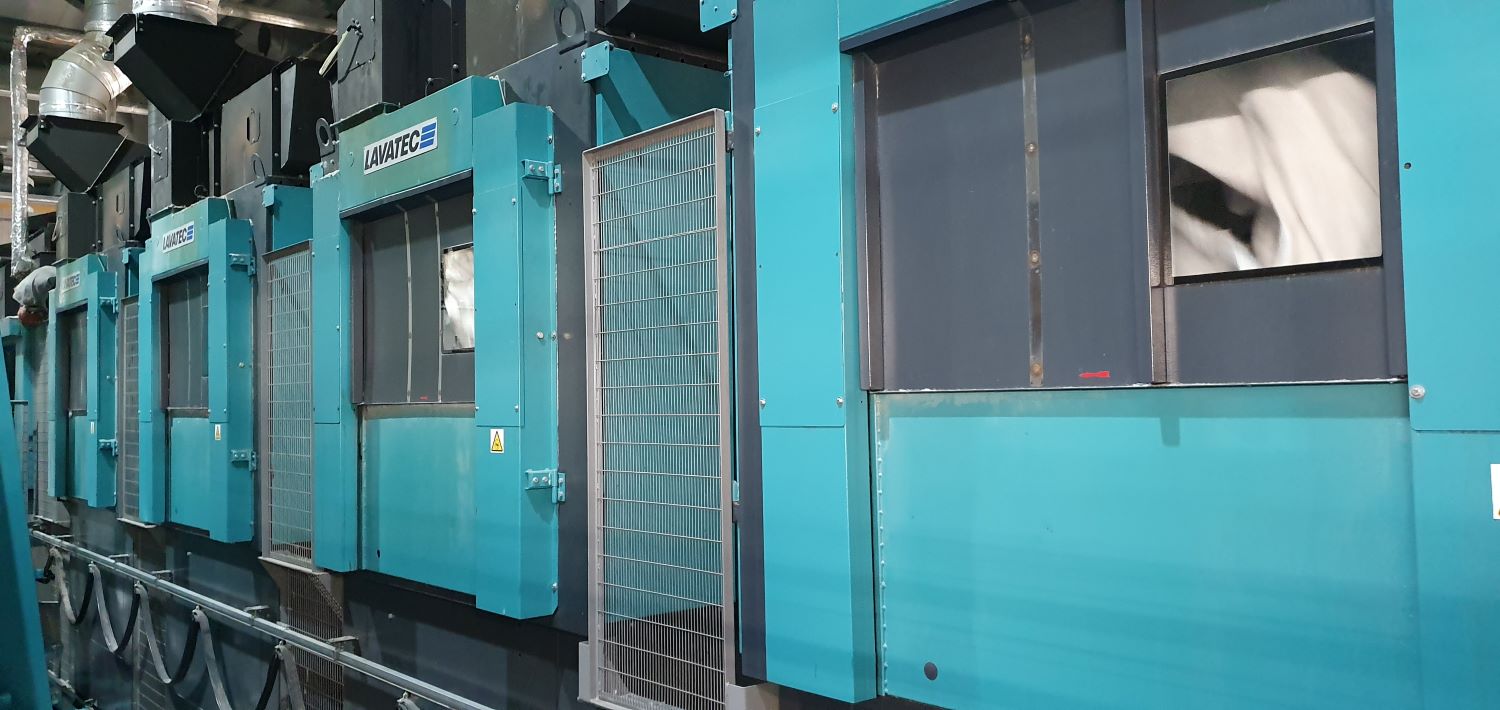 Four x Lavatec Model TT745 GU, gas-fired, 100kgs capacity transfer tumbler dryers, with Lavatec telescopic type double shuttle and call-off controls. All dryers include Infra Red drying assistance.